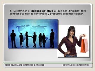 El documento describe los 7 pasos para crear una tienda virtual exitosa: 1) Determinar el público objetivo, 2) Diseñar la web para ese público, 3) Promocionar la web y estrategia de ventas, 4) Captar y fidelizar clientes, 5) Establecer formas de envío, 6) Fijar precios adecuados, 7) Ofrecer formas de pago. Finalmente, propone 3 alternativas para la puesta en marcha técnica: diseñar una web sencilla, contratar un programador o comprar un paquete