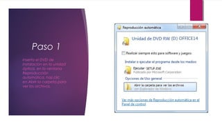 El documento proporciona 11 pasos para instalar Microsoft Office 2010, comenzando con la inserción del DVD de instalación, seleccionando los archivos y carpetas para copiarlos a una unidad USB, ejecutar el archivo Setup.exe en la unidad USB para iniciar la instalación, introducir la clave de producto, aceptar los términos de la licencia, hacer clic en Instalar ahora y esperar a que finalice la instalación.