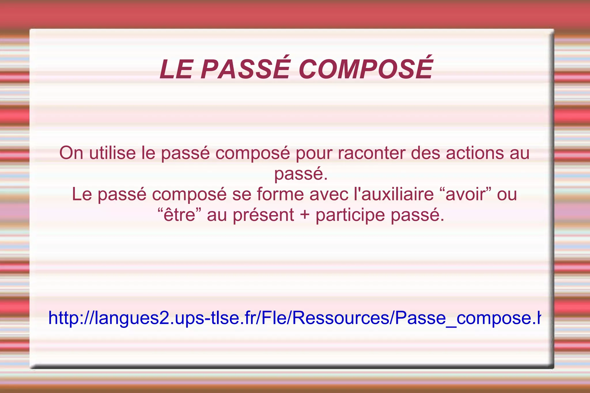 Este documento describe el uso del pasado compuesto en francés para relatar acciones pasadas. El pasado compuesto se forma con el auxiliar "haber" u "estar" en presente más el participio pasado. También proporciona un enlace a más información sobre esta construcción gramatical.