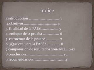 La prueba PAES evalúa los conocimientos de los estudiantes de segundo año de bachillerato en matemáticas, estudios sociales, lenguaje y literatura y ciencias naturales. Los resultados de la prueba han variado entre 2011-2012 debido a cambios en la metodología de enseñanza. La preparación de los estudiantes depende principalmente del proceso pedagógico en el aula.