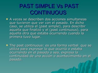 El documento explica la diferencia entre el past simple y el past continuous en inglés. El past simple se usa para acciones que ya terminaron, mientras que el past continuous se usa para acciones que estaban ocurriendo o continuando en el pasado. El documento proporciona ejemplos de cómo usar ambos tiempos verbales para describir eventos simultáneos en el pasado.