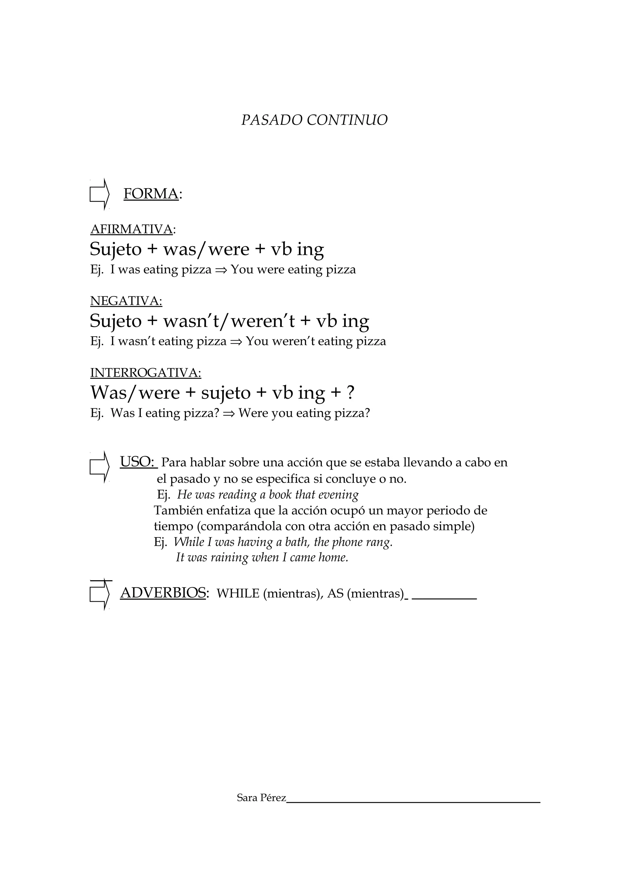El documento explica la forma, uso y adverbios del pasado continuo en inglés. Describe la forma afirmativa, negativa e interrogativa del pasado continuo y cómo se usa para hablar de acciones que estaban ocurriendo en el pasado sin especificar si terminaron o no, o para enfatizar que una acción tomó más tiempo que otra en pasado simple. También menciona los adverbios "while" y "as" que se usan con el pasado continuo.