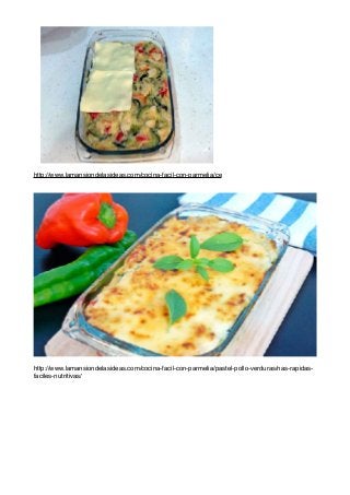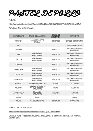 Este documento presenta una receta modificada de pastel de pollo y verduras. Se propone eliminar la harina y la mantequilla de la receta original y en su lugar usar un espesante como la gelatina. También se sugiere reducir la cantidad de aceite usado para saltear las verduras y el pollo, y finalizar cubriendo la mezcla con queso rallado antes de gratinar en el horno.