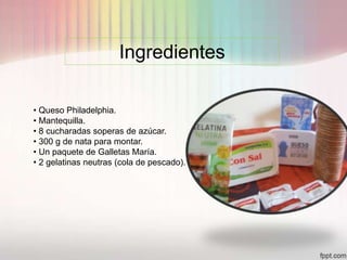 Este documento proporciona instrucciones para hacer un pastel de queso en 7 pasos. Primero, se derrite la mantequilla y se trituran las galletas María. Luego, se mezclan las galletas trituradas con la mantequilla derretida y se coloca la mezcla en un molde para congelar. Más tarde, se calienta la nata con azúcar sin que hierva y se agrega la gelatina neutra disuelta previamente. Finalmente, la mezcla se vierte sobre la base congelada en el molde y
