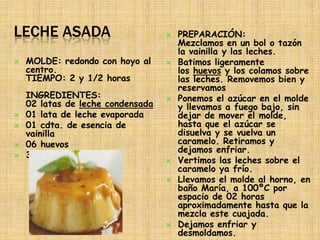 Este documento contiene recetas para varios postres típicos peruanos como leche asada, chirimoya alegre, masa básica y suspiro limeño. Proporciona una lista de ingredientes y pasos detallados para preparar cada uno.