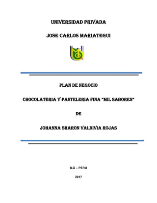 El plan de negocio propone la creación de 'Chocolatería y Pastelería Fina Mil Sabores' en Ilo, Perú, centrada en la elaboración de tortas y chocolates personalizados para satisfacer una demanda no atendida en el mercado local. Se busca establecer una empresa líder a través de productos innovadores, enfoque en calidad, y herramientas de marketing digital, con el objetivo de duplicar la producción y generar un 10% de utilidad mensual. Se identifican pocas competencias en el área y se menciona un análisis FODA que destaca las oportunidades de crecimiento en un mercado poco competitivo.