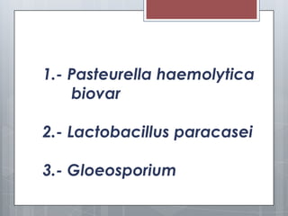 Este documento presenta información sobre tres microorganismos: Pasteurella haemolytica biovar, Lactobacillus paracasei y Gloeosporium. Describe la clasificación, características, aislamiento y tipos de cada microorganismo. También incluye cuadros sobre la epidemiología, patogenia, tratamiento y aspecto de colonias de P. haemolytica.