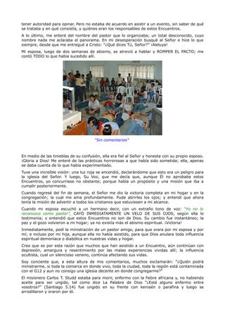 El testimonio del pastor Marcos Andrés describe su experiencia y preocupaciones sobre los encuentros G-12, los cuales han tenido un impacto negativo en su congregación y su familia. Después de asistir a uno de estos encuentros, observó cambios alarmantes en las actitudes y comportamientos de los asistentes, indicando una manipulación y adoctrinamiento sutil. A pesar de la presión social para participar, se mantiene firme en la defensa de la sana doctrina y la importancia de basar la fe en las Escrituras.