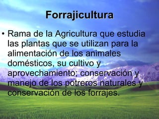 El documento habla sobre los pastos y forrajes. Explica que la forrajicultura estudia las plantas utilizadas para alimentar animales domésticos, su cultivo y aprovechamiento. Describe los diferentes tipos de forrajes según su origen, composición química, época de crecimiento y uso. También explica los conceptos de potreros y cómo se clasifican las plantas forrajeras.