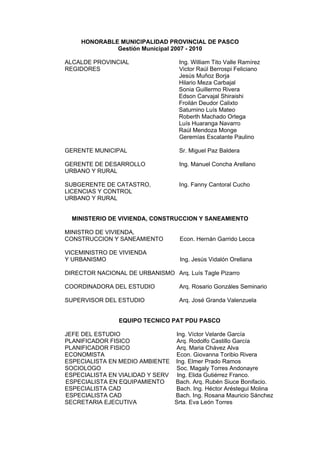 Este documento presenta el Informe Final para Consulta y Exhibición Pública del Plan de Acondicionamiento Territorial de la Provincia de Pasco 2006-2016. Contiene un volumen con el diagnóstico provincial que incluye la caracterización socio-cultural, económica, ambiental y territorial de Pasco. También presenta el marco regional y las consideraciones generales del estudio como objetivos, metodología y proceso de consulta.
