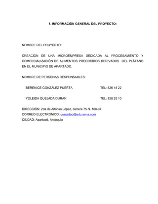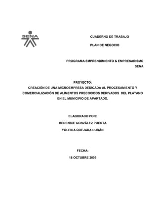 Este documento presenta un plan de negocio para crear una microempresa dedicada al procesamiento y comercialización de alimentos precocidos derivados del plátano en el municipio de Apartadó, Antioquia. Incluye información general del proyecto, un estudio de mercado con análisis de la competencia, clientes potenciales, y caracterización de la población objetivo. El documento también cubre aspectos legales, organizacionales y financieros para evaluar la viabilidad del proyecto.