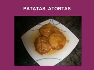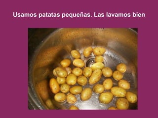 El documento proporciona instrucciones para preparar patatas fritas y escabeche. Explica cómo pelar, lavar y cocer pequeñas patatas, aplastarlas suavemente y freírlas a temperatura media. Luego detalla cómo hacer el escabeche con aceite de oliva, ajos, laurel, clavos y pimienta, y cómo añadir vinagre, sal y agua para cocinarlo durante 5 minutos. Finalmente, indica que las patatas fritas se sumergen en el escabeche y se sirven en un recipiente de barro