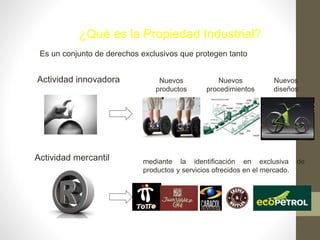 La propiedad industrial protege invenciones, diseños industriales y marcas a través de patentes, modelos de utilidad y registros. Las patentes protegen productos, procedimientos y mejoras funcionales por un plazo de 10 a 20 años. Los modelos de utilidad protegen nuevas formas o configuraciones por 15 años. Cualquier persona puede solicitar estas protecciones siguiendo el proceso establecido en la ley.