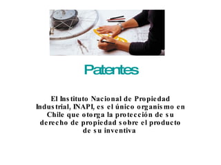El documento explica los diferentes tipos de protección de propiedad intelectual que ofrece el Instituto Nacional de Propiedad Industrial de Chile (INAPI). Describe las patentes de invención, modelos de utilidad y diseños industriales, incluyendo sus requisitos, duraciones y derechos conferidos a los titulares. Resalta que la protección de las ideas las convierte en activos comerciales y que los incentivos a la innovación permiten mejorar la calidad de vida.