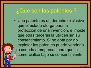 Este documento explica qué son las patentes, los beneficios de patentar un invento, la legislación vigente sobre patentes en Colombia y algunos inventos que han sido patentados en Colombia recientemente. Las patentes otorgan derechos exclusivos sobre una invención para prevenir que otros la utilicen sin permiso. Algunos beneficios de patentar un invento incluyen atraer inversionistas, prevenir conflictos legales y facilitar la comercialización. La legislación aplicable en Colombia sobre patentes es la Decisión 486 de la Comunidad Andina. Inventos patentados recientemente