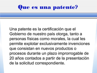 Una patente es una certificación otorgada por el gobierno a individuos o empresas para explotar exclusivamente una invención nueva durante 20 años. Para registrar una patente se requiere llenar una solicitud, comprobante de pago, descripción e ilustraciones de la invención. El Instituto Mexicano de la Propiedad Industrial es el organismo encargado de otorgar patentes en México.