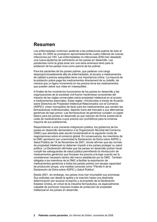 El documento discute los desafíos que enfrentan los países en desarrollo para garantizar el acceso a medicamentos asequibles debido a las normas de propiedad intelectual. A pesar de la Declaración de Doha de 2001 que buscaba equilibrar los derechos de propiedad intelectual con el acceso a la salud, los países ricos y las compañías farmacéuticas han socavado sus compromisos. Se insta a la OMC y a los países a revisar el impacto de los acuerdos sobre propiedad intelectual y a garantizar
