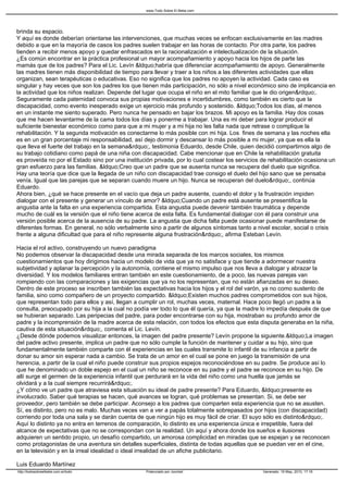 Este documento explora el rol del padre ante la llegada de un hijo con discapacidad. Aunque tradicionalmente se pensaba que los padres se ausentaban o tenían dificultades para aceptar un hijo con discapacidad, especialistas actuales indican que tanto padres como madres experimentan el duelo por la pérdida del hijo ideal. Además, aunque las madres suelen tener más disponibilidad de tiempo, el nivel de apoyo de los padres depende de cada caso particular. El documento también presenta el testimonio de un padre comp