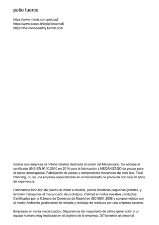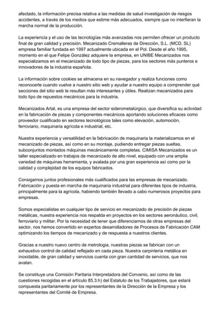 Este documento trata sobre varias empresas dedicadas al mecanizado y fabricación de piezas metálicas en España. Describe los servicios que ofrecen como mecanizado de alta precisión y calidad para sectores como aeroespacial, automoción, ferroviario e industrial. También menciona que cuentan con certificados de calidad y equipamiento avanzado para satisfacer las necesidades de sus clientes.