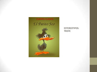 El documento habla sobre los estereotipos presentes en el cuento clásico de Patito Feo. Menciona que los estereotipos incluyen a Patito siendo triste y amable, pero discriminada por sus hermanos. A pesar de la discriminación, Patito es feliz. El documento también menciona otros estereotipos como la apariencia física y discapacidades. Finalmente, enfatiza la importancia de romper con los estereotipos transmitidos por los medios de comunicación para construir una sociedad más diversa e inclusiva.