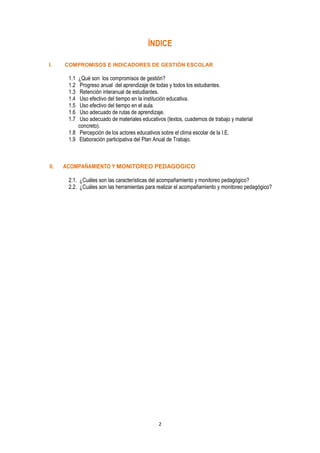 Este documento presenta los compromisos e indicadores de gestión escolar centrada en los aprendizajes. Describe 8 compromisos agrupados en compromisos de resultado, proceso y planificación. Explica cada compromiso y cómo implementarlos, incluyendo el análisis de datos de aprendizaje, establecimiento de metas y planificación docente. El objetivo es mejorar los aprendizajes mediante una gestión con liderazgo pedagógico orientada a resultados.
