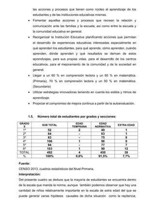Este documento presenta el Plan Anual de Trabajo por la Mejora de los Aprendizajes 2014 de una institución educativa. El plan incluye datos de la institución, objetivos, diagnósticos de los aprendizajes, metas y estrategias. El objetivo general es identificar problemas que afectan la calidad de los aprendizajes y fortalecer la calidad a través de experiencias educativas centradas en cómo y para qué aprenden los estudiantes. Se presentan diagnósticos y metas por grado y área, así como estrategias a implement