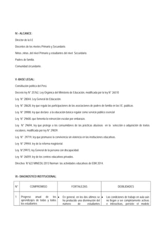 El plan anual de trabajo de la Institución Educativa N° 40164 “José Carlos Mariátegui” establece objetivos y metas para el año escolar 2014 con el fin de mejorar la calidad educativa. Se realizó un diagnóstico institucional que identificó fortalezas y debilidades en 8 compromisos de gestión. El plan propone actividades para lograr un buen inicio del año escolar, mejorar los aprendizajes fundamentales, y cumplir con los objetivos y metas establecidas para cada compromiso.