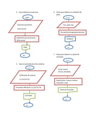 El documento presenta una serie de 17 pasos o instrucciones para realizar diferentes cálculos y actividades como sumar números, calcular áreas, sacar promedios, ordenar datos, determinar el mayor entre dos valores, elaborar recetas de comida y revisar un horno cada cierto tiempo.