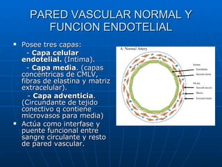 El documento detalla la patogénesis de la aterosclerosis, destacando la función del óxido nítrico (ON) en la salud de la pared vascular y cómo su disfunción promueve el desarrollo de la enfermedad. Describe el proceso inflamatorio que involucra la acumulación de LDL oxidado y la formación de placas ateroscleróticas, así como la inestabilidad de estas placas que pueden llevar a eventos trombóticos. Finalmente, se examina cómo el remodelado vascular y la respuesta del endotelio influyen en la progresión de la aterosclerosis.