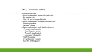 Este documento describe la patogénesis de la fibrosis pulmonar idiopática y la vasculitis pulmonar. Explica que la fibrosis pulmonar idiopática se caracteriza por áreas de pulmón relativamente sano con regiones de fibrosis subpleural y fibrosis marcada. También discute varias hipótesis sobre los mecanismos que contribuyen a la patogénesis, incluido el daño a las células epiteliales alveolares, la remodelación vascular anormal, la producción excesiva de moléculas de la matriz extracelular, y