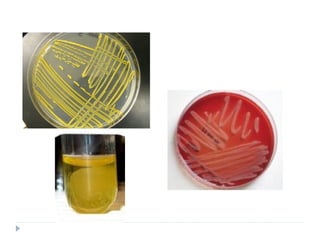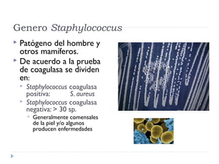 El documento describe la familia Staphylococcaceae, con énfasis en el género Staphylococcus. Staphylococcus aureus es una bacteria Gram positiva que forma racimos y es un patógeno humano común que causa infecciones supurativas. Produce diversas toxinas y enzimas que le permiten adherirse a tejidos, evadir el sistema inmune y causar enfermedades como intoxicación alimentaria y síndrome de shock tóxico. Otras especies como S. epidermidis son comensales de la piel pero también pueden caus