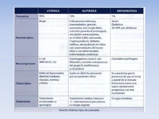 Este documento describe la anatomía y fisiopatología de la vía biliar. Explica que la litiasis biliar se forma habitualmente en la vesícula biliar y puede ocurrir a cualquier nivel de las vías biliares. Describe las complicaciones de la colelitiasis como el cólico vesicular, la colecistitis aguda y crónica, así como el manejo quirúrgico y endoscópico de estas afecciones.