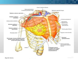 Este documento describe la anatomía, fisiología, factores de riesgo, signos y síntomas, y patologías mamarias benignas más comunes. Describe la situación, irrigación arterial y venosa, drenaje linfático e inervación de la mama, así como su estimulación hormonal. Explica los cambios normales en la mama, el examen clínico incluyendo autoexploración, inspección y diferentes técnicas de palpación. Resalta dos patologías benignas frecuentes: el fibroadenoma mamario y la