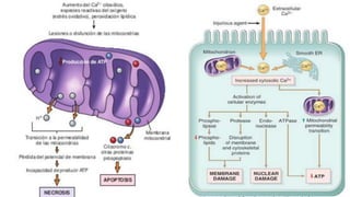 - La necrosis ocurre cuando hay lesiones graves en las membranas celulares que causan la digestión enzimática de la célula y la liberación de su contenido. La apoptosis es una muerte celular programada que mantiene la integridad de la membrana y elimina las células de forma fisiológica.