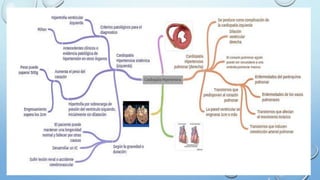 Este documento resume las principales características anatómicas y fisiológicas del corazón, así como varias patologías cardíacas. Describe la estructura del miocito cardiaco, las capas del corazón y las propiedades del miocardio. Explica diferentes tipos de cardiopatías congénitas como comunicaciones interauricular e interventricular, conducto arterioso persistente, tetralogía de Fallot y transposición de grandes arterias. También cubre cardiomiopatías isquémica, hipertensiva y valvular,