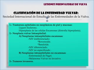 Este documento presenta información sobre la patología maligna de la vulva. En primer lugar, describe trastornos epiteliales no neoplásicos como el liquen escleroso y la hiperplasia de las células escamosas. Luego, detalla las neoplasias intraepiteliales vulvares, incluidas las escamosas y no escamosas. Finalmente, explica los tumores invasores de vulva, su clasificación y factores de riesgo asociados.