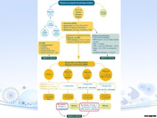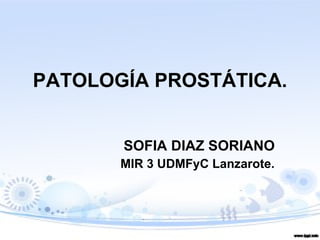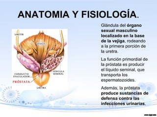 Este documento resume la anatomía, fisiología y principales patologías de la próstata. Describe la hipertrofia benigna de próstata, las prostatitis aguda y crónica bacteriana y abacteriana, y el cáncer de próstata. Explica los síntomas, exámenes y tratamientos de estas afecciones prostáticas.