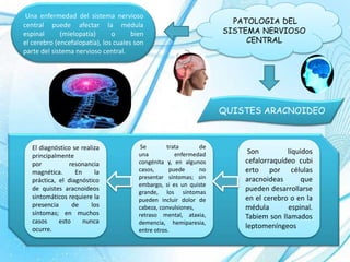 Este documento resume varias patologías del sistema nervioso central y periférico. Describe quistes aracnoideos, una enfermedad congénita que puede causar dolor de cabeza u otros síntomas. Explica la enfermedad de Parkinson, un trastorno neurodegenerativo que afecta los movimientos y puede causar temblor, lentitud y problemas de equilibrio. También analiza el síndrome de Guillain-Barré, una polineuropatía desmielinizante aguda que causa debilidad muscular e involucra la inflamación