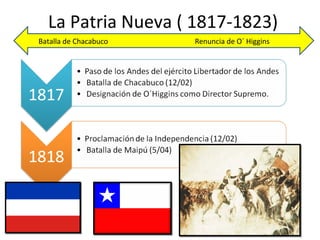 El documento resume la etapa de la Patria Nueva en Chile entre 1817 y 1823 bajo el liderazgo de Bernardo O'Higgins. Durante este período, O'Higgins impulsó obras educativas, sociales, económicas e internacionales, pero enfrentó descontento de la aristocracia, los Carrerinos y el clero. Esto finalmente llevó a que el cabildo le pidiera la renuncia a O'Higgins en 1823.