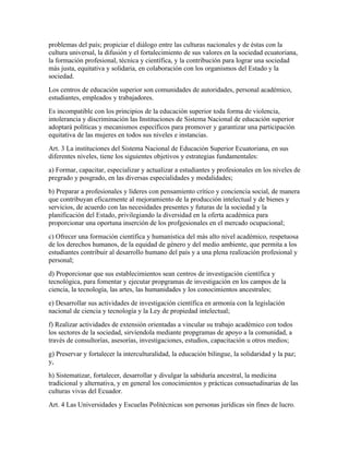 Este documento presenta partes de una ley de educación superior ecuatoriana. Establece el marco legal para el sistema de educación superior del país, incluyendo la creación de un Consejo Nacional de Educación Superior (CONESUP) para regular y coordinar el sistema. También establece una Asamblea de la Universidad Ecuatoriana como el máximo organismo de políticas para el sistema universitario. Define los objetivos y principios de las instituciones de educación superior, como la búsqueda de la verdad y el desarrollo cultural y científico.