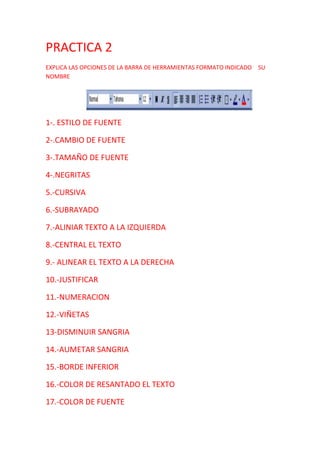 El documento explica las opciones de la barra de herramientas de formato, incluyendo estilo, tamaño y color de fuente, alineación de texto, numeración, viñetas, sangría y borde inferior. También instruye al lector a realizar un dibujo en Paint y explicar la función de los botones para abrir, guardar y crear nuevos archivos.
