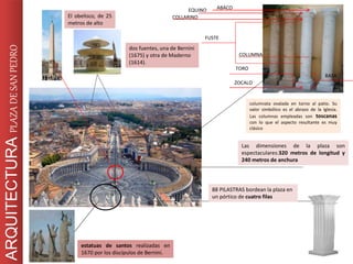 El documento describe varias obras arquitectónicas y escultóricas de estilo barroco en Italia y España. Menciona detalles arquitectónicos como columnas y órdenes clásicos de la Plaza de San Pedro y la Iglesia de San Carlos de las Cuatro Fuentes en Roma. También describe esculturas como El rapto de Proserpina y retratos de David. Finalmente, analiza pinturas de Murillo como Niños jugando a los dados y Niños comiendo uvas y melón por su naturalismo.