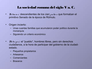 El documento describe la sociedad romana en el siglo V a.C., caracterizada por el conflicto entre los patricios y plebeyos. Los patricios eran una clase privilegiada que buscaba mantener su exclusividad política, mientras que los plebeyos luchaban por igualdad de derechos. Esta lucha condujo a varias reformas que otorgaron más poder a los plebeyos a lo largo del siglo, culminando con la igualdad formal de derechos entre ambos grupos.