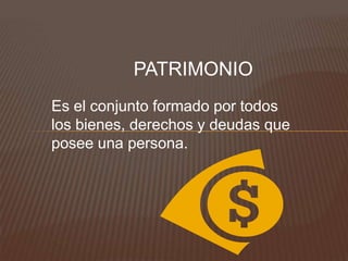 El documento define patrimonio como el conjunto de bienes, derechos y deudas de una persona. Explica que el patrimonio neto surge de restar las deudas al total de bienes y derechos. Proporciona un ejemplo numérico para ilustrar cómo calcular el patrimonio y patrimonio neto de alguien con determinados activos y pasivos.