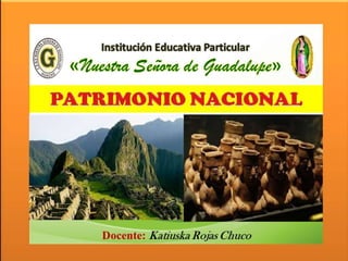 El documento define el patrimonio nacional como los elementos naturales y culturales que los antepasados han legado. Explica que el patrimonio nacional se divide en patrimonio natural y cultural. A su vez, el patrimonio cultural se divide en material e inmaterial; el patrimonio cultural material incluye objetos muebles e inmuebles, mientras que el patrimonio cultural inmaterial son los rasgos espirituales e intelectuales de una sociedad.