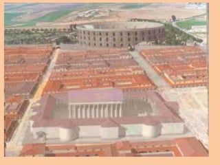 Este documento describe varios ejemplos del arte y la arquitectura romana que se encuentran en Andalucía, incluyendo calzadas, acueductos, anfiteatros, mosaicos y estatuas en ciudades como Sevilla e Itálica, así como los restos de la antigua ciudad de Baelo Claudia.