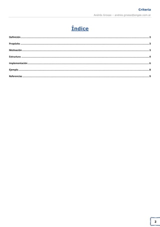 El patrón Criteria permite filtrar colecciones de objetos según diversos criterios de forma desacoplada, permitiendo encadenar y reutilizar criterios mediante operaciones lógicas como AND y OR. Esto provee una forma extensible y legible de filtrar colecciones según lógica que puede cambiar. El patrón se implementa mediante interfaces y clases que representan cada criterio y operaciones entre ellos.