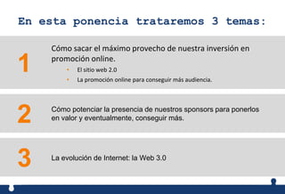 La ponencia de Montserrat Peñarroya aborda cómo maximizar inversiones en promociones online a través de un sitio web 2.0 orientado al cliente, el uso de herramientas 2.0 y la importancia de la segmentación del público. También se discute la relevancia de potenciar la presencia de sponsors y el impacto de la evolución hacia la web 3.0, la geolocalización y la realidad aumentada. Finalmente, se enfatiza la necesidad de utilizar técnicas de marketing digital y crear espacios para sponsors en el ámbito del marketing móvil.