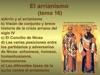 El documento resume la herejía del arrianismo en el siglo IV, incluyendo las enseñanzas de Arrio, las diferentes posiciones teológicas sobre la Trinidad, y los concilios eclesiásticos que lidiaron con la herejía, particularmente el Concilio de Nicea en 325 d.C. El arrianismo negaba la divinidad de Cristo y su igualdad con el Padre, lo que llevó a intensos debates y controversias que dividieron a la Iglesia por varias décadas.
