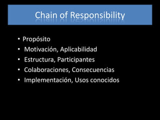 Este patrón permite pasar solicitudes a través de una cadena de manejadores hasta que uno de ellos la maneja, evitando que un solo objeto se apodere de la solicitud. Se usa cuando varios objetos pueden manejar una solicitud y el manejador no se conoce de antemano. El cliente genera solicitudes que pasan a través de la cadena de manejadores específicos hasta que uno la procesa. Esto reduce el acoplamiento y añade flexibilidad para asignar responsabilidades dinámicamente.